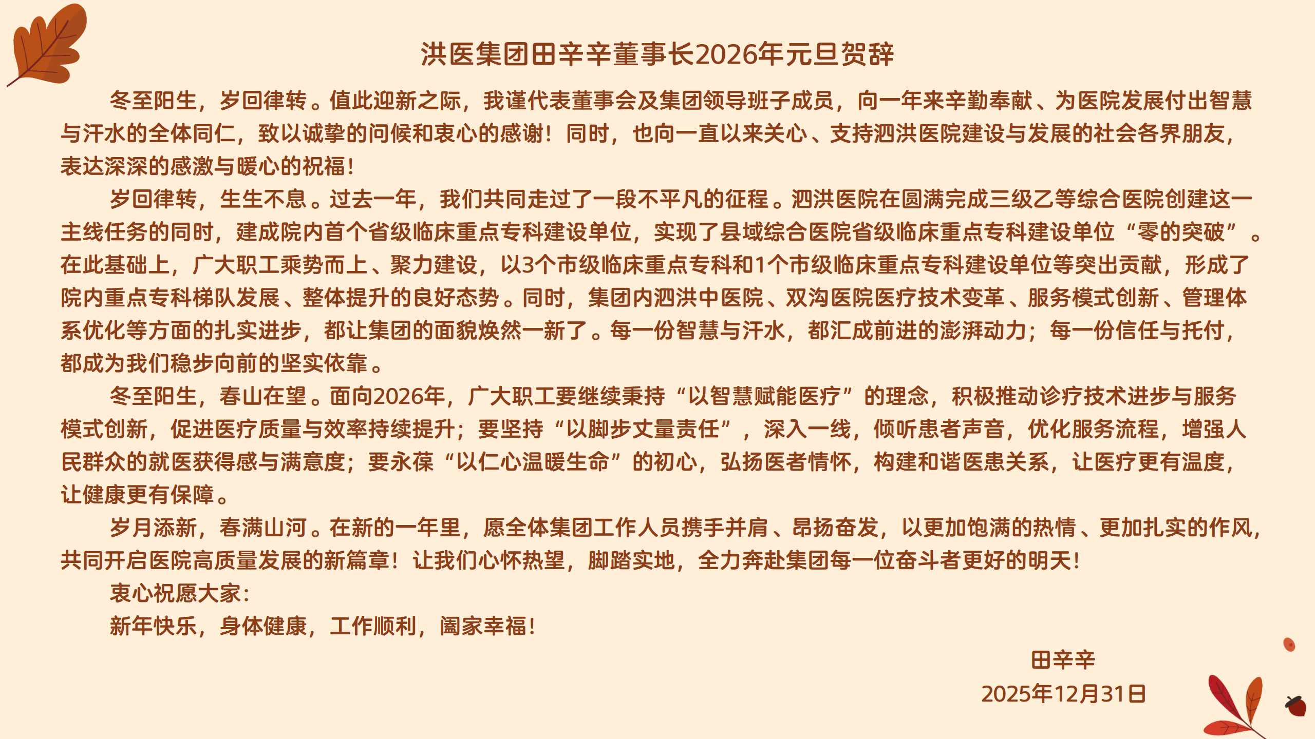 洪医集团田辛辛董事长2026年元旦贺词