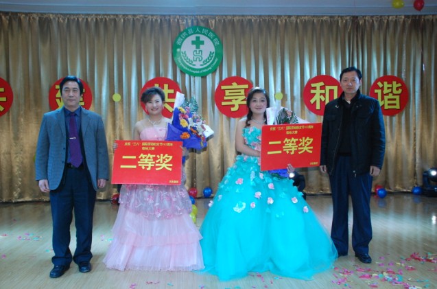 歌咏大赛院直代表选手刘冰玲获得大赛一等奖;中医院代表选手许峰和门诊代表选手杨珊珊获得大赛二等奖;外科代表选手李姝珍、儿科代表选手盛慧如、五里江医院代表选手陆晨霞获得大赛三等奖;内科代表选手裴梦梦、药材代表选手杨子怡、总务代表选手黄茜、第三人民医院代表选手任许红获得大赛优秀奖。
