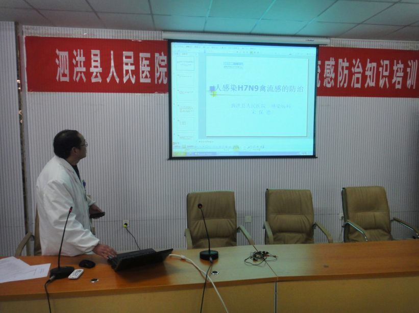 1月15日,泗洪县人民医院举办了防治人感染H7N9禽流感专题讲座,此次讲座由呼吸内科主任施学进主讲。全院内科医生及护理人员100余人参加了讲座。