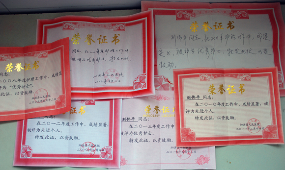 “她的工作表现,一直都是得到患者和医护人员的肯定和夸奖,是我们科室的中流砥柱,年轻的护士都亲切地尊称她为刘老师。”九病区的护士长岳晓林对这个得力助手连连称赞,“她对工作的尽心尽职,是我们有目共睹的,去年她怀孕临产前半小时还在工作着。