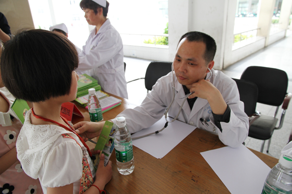 义诊现场,医生们为每个学生逐一细心地检查身体,量身高、测体重、量血压,医护人员望着孩子一张张可爱的脸,检查时候忍不住摸摸学生的头,认真的跟学生们交流、沟通,询问学生们的身心状况,并将检查信息反馈给老师。
