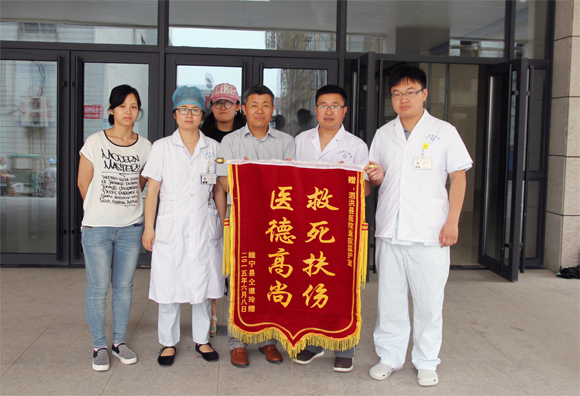 为了感谢我院ICU(重症医学科)医护人员的救命之恩,6月9日上午,仝道玲带着妻子和女儿特地从徐州睢宁赶到泗洪县人民医院,将一面绣有“救死扶伤医德高尚”的锦旗递到我院副院长、重症医学科主任陈鹏手中,表达对ICU全体医护人员的感激之情。