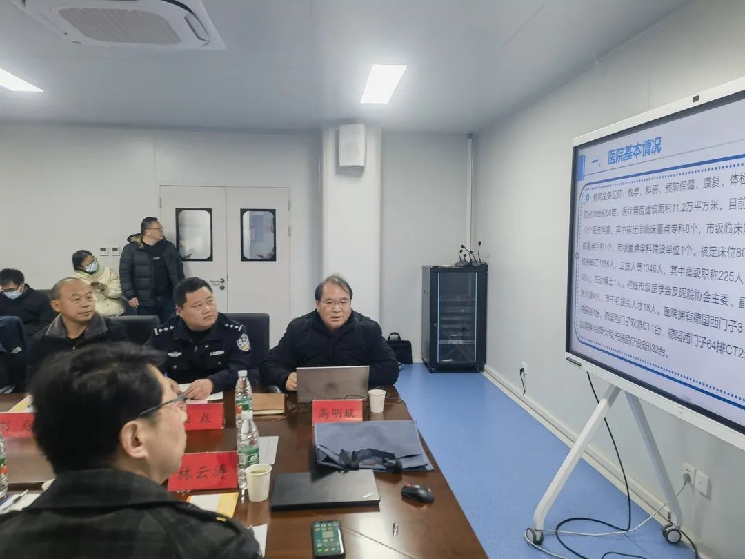 12月15日上午,江苏省平安医院建设考评专家组一行,在省卫健委医政医管处监察专员管士弟的带领下,对我院平安医院建设工作进行考评指导。泗洪县副县长陈飞,县卫健局党委书记、局长唐献荣,县司法局党委委员刘炎,县卫健局党委委员刘修凯,县公安局治安大队内保中队负责人姚磊等领导陪同考评。洪医集团副董事长、泗洪医院院长高明献,副院长董红军,副院长陈虎及相关职能科室负责人接待了考评组一行。
